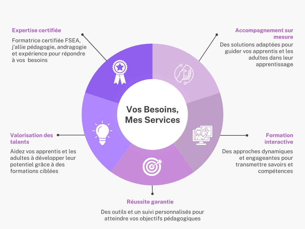 Animée par une véritable passion pour la transmission de savoirs, j’ai décidé d’élargir mes horizons en obtenant le certificat de formatrice d’adultes FSEA. Ce nouveau chapitre dans mon parcours me permet d’apporter une approche moderne et adaptée à un public adulte, en valorisant leurs compétences préalables tout en proposant des formations engageantes et attractives, tant en présentiel qu’à distance.